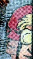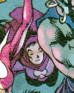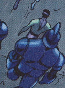 Page 18 – Panel 2: unknown villain in orange and yellow; might be the Enforcer but that suit was mostly green.