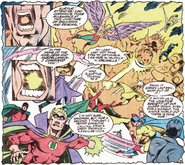 Page 18 – Panels 4 to 6: And the reason is because he’s busy battling the Justice Society thanks to the rather convoluted events in THE LAST DAYS OF THE JUSTICE SOCIETY OF AMERICA. At the top of the panel is Hawkman and Hawkgirl; below Hawkman is Thunderbolt; below Hawkgirl is Wildcat. Below Thunderbolt is Sandman; then Starman to the right; then Hourman. Across the bottom from the left are Dr Midnite; Green Lantern; Johnny Thunder; the Flash; the Atom; and with his back to us, Sandy the Golden Boy. Atom’s comment about not stopping “even for a moment” refers again to THE LAST DAYS where the JSA had agreed to battle against Surtur for the rest of eternity to prevent him destroying the world.
