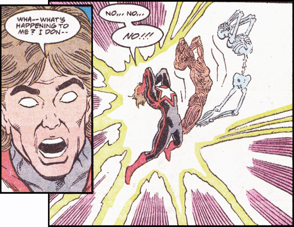Page 21 – Panels 6 and 7: Phobos exposes and delights in Starman’s deep seated fear of losing his identity, of becoming nothing more than “energy trapped in a costume.” Phobos also mentions Starman’s alter-ego, Will Payton.