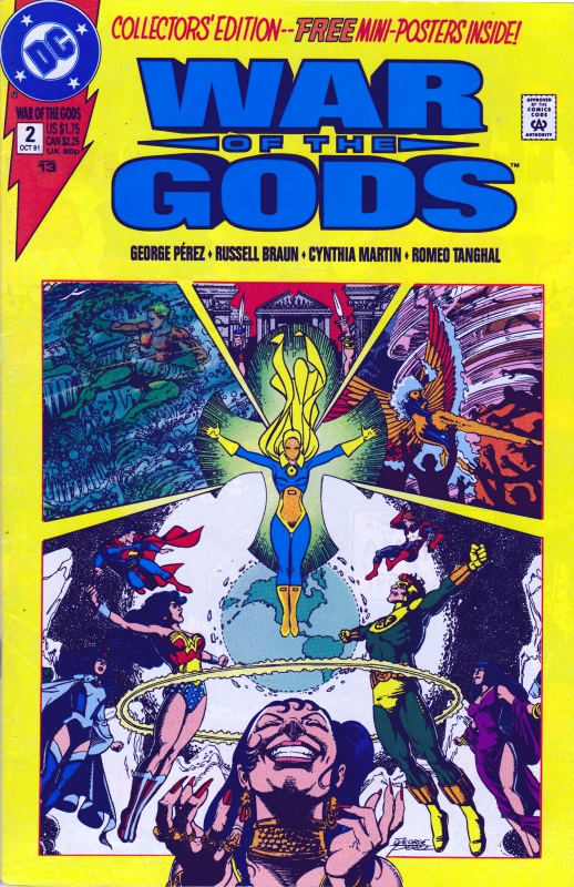 Collectors’ Edition Cover on the right: Same as the above but with the border around it, obscuring Power Girl; Hercules; Son of Vulcan; Firestorm; Shango; Spectre; and Phantom Stranger.