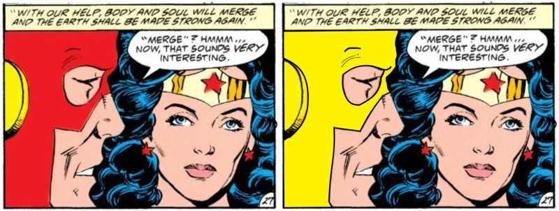 Page 34 – Panels 5 and 6: Circe’s spell, instead of torturing the Earth, now actually protects it.