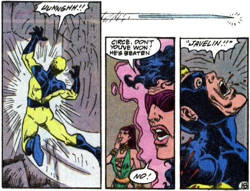 Page 18 – Panel 4: Ignoring Nightshade’s advice, Javelin launches his namesake weapon against Circe who simply casts a spell and turns it around.