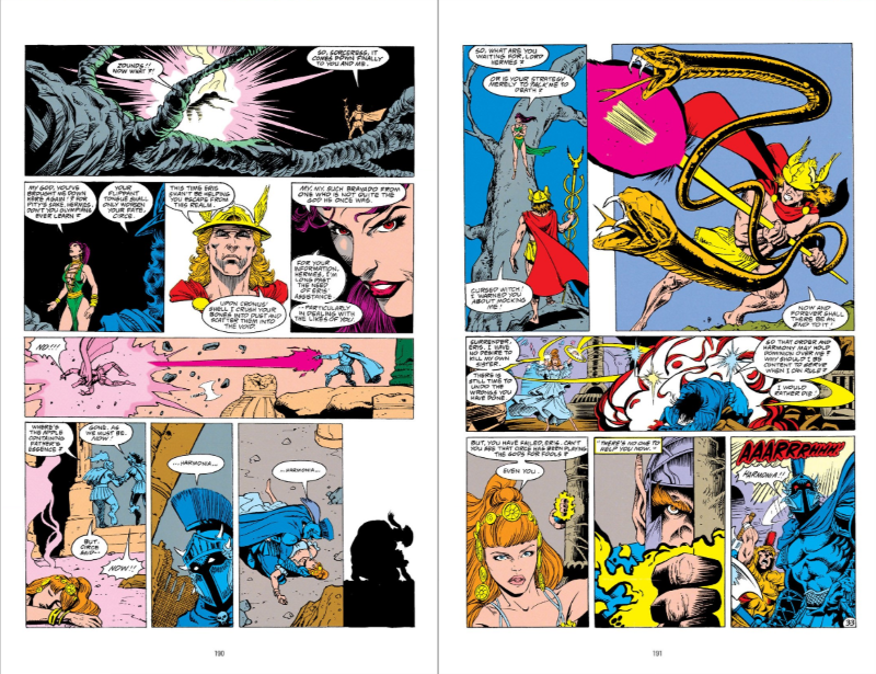 Note about Pages 32 and 33: In this two page spread, the top half of both pages deal with Hermes facing off against Circe; the bottom halves deal with Harmonia, Eris and Ares. This latter section was printed the wrong way around in both the original comic and then in the collected edition, the first half of the battle appearing on Page 33, the second half on Page 32. The corrected version below is a simple cut and paste job done by myself in order to illustrate what I mean: