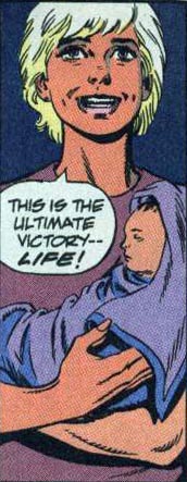 Page 26 – Panel 7: Power Girl and her baby son. Their story was continued in the pages of JUSTICE LEAGUE AMERICA where the child grew to adulthood in the space of weeks, became a hero called Equinox, fought a made to measure bad guy called Scarabus and then vanished never to be heard of again. Ever. And we’ll say no more about it.