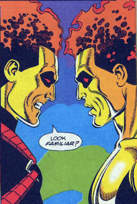 Page 23 – Panel 2: And before Extant was Monarch he was, as Waverider says, the hero Hawk who went mad in ARMAGEDDON 2001.