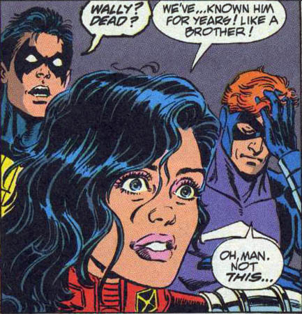 Page 16 – Panel 1: Nightwing, Darkstar Donna Troy and Arsenal (who wasn’t shown in the two page spread) are shocked to hear of the Flash’s death; they had all served as Teen Titans originally.