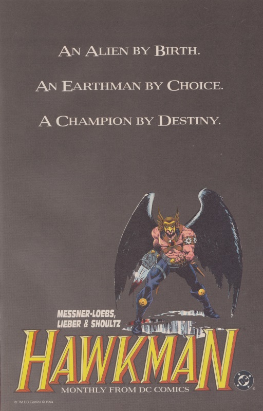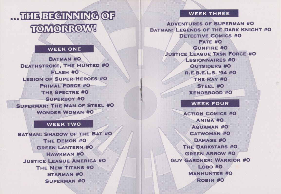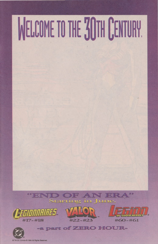 A DC Universe page that offered some hints as to the events of ZERO HOUR as well as complete nonsense.Following ZERO HOUR would be Zero Month, showcasing new heroes as well as current ones.The final issue of ZERO HOUR had a card insert advertising Zero Month; this is the exterior . . .. . . and this is the interiorThis was an ad for the 1994 Chicago ComiconCOMICS VALUES MONTHLY #95