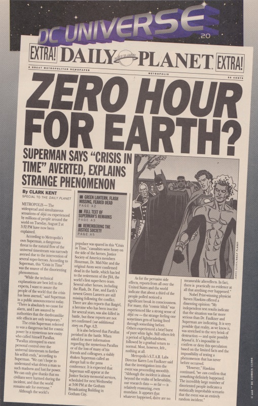 A mocked up front page of the Daily Planet, the article confirms the death of several JSA members and the retirement of the remainder, as well as detailing the effects felt by “about a third of the people” of the Earth. It also mentions that the Zero Hour event happened on Tuesday, 2nd of August, firmly dating it to 1994.